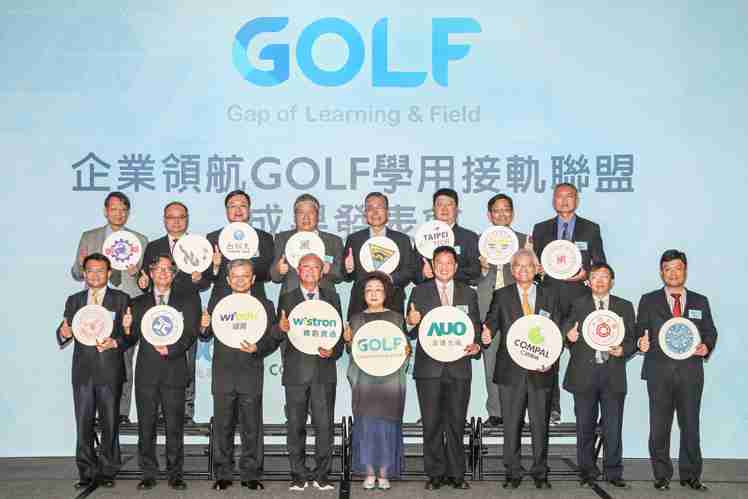 GOLF学用接轨联盟集结企业和学校的力量,,打造「学用合一、、、产学接轨」的创新合作平台 (前排左起:淡江大学副校长何启东、、、元智大学校长林启瑞、、、纬育执行长许延岳、、、纬创总经理暨执行长黄柏漙、、教育部政务次长范巽绿、、、、人生就是博董事长暨执行长彭双浪、、、仁宝总经理暨执行长翁宗斌、、、大同大学校长何明果、、、圣约翰科大校长艾和昌;后排左起:明新科大校长林启瑞、、、龙华科大校长葛自祥、、、台湾科大校长廖庆荣、、、、中兴大学副校长郑政峯、、、中央大学校长周景扬、、、、台北科大副校长任贻均、、、中华科大副校长石大明、、明志科大校长刘祖华)