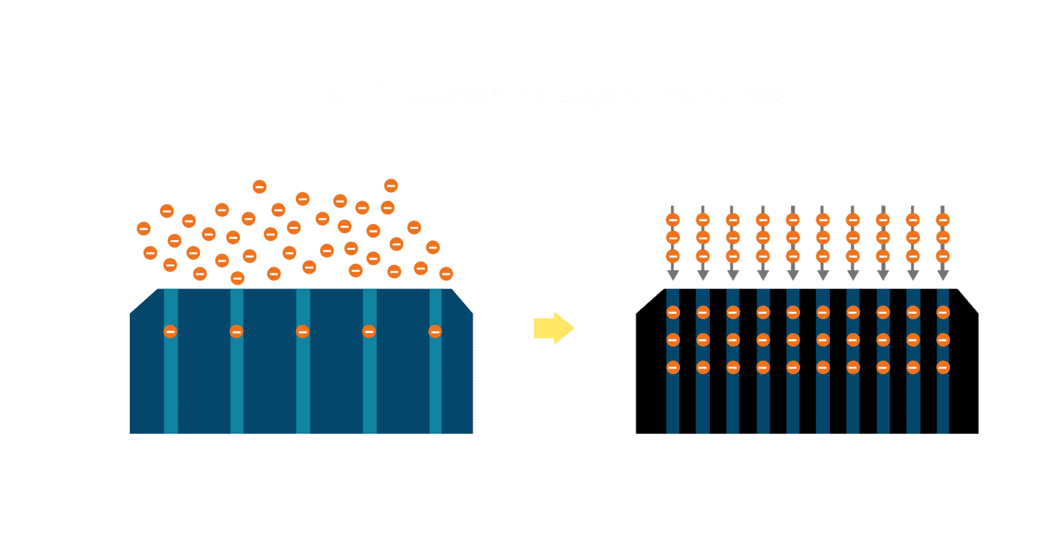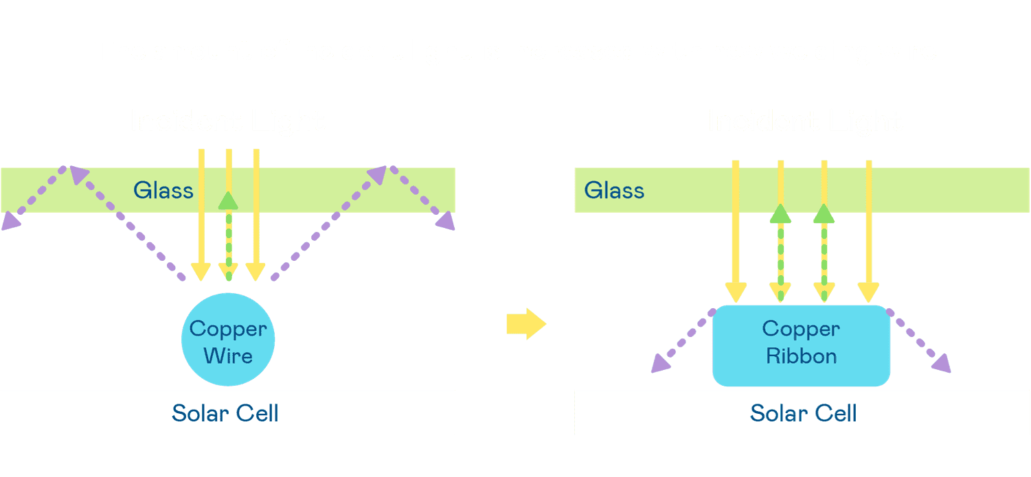 - 电池使用多条铜导线 (Copper wire) 于电池片上形成较短的电流路径,,,,提高电流收集效率,,,,采用圆形设计的铜导线较传统扁平式的铜焊带 (Ribbon),,,可增加入射至电池的光线量。。。