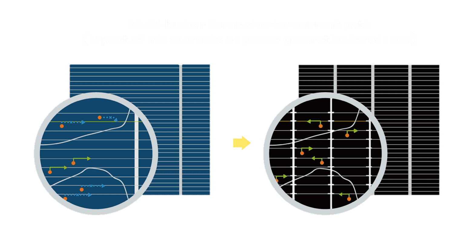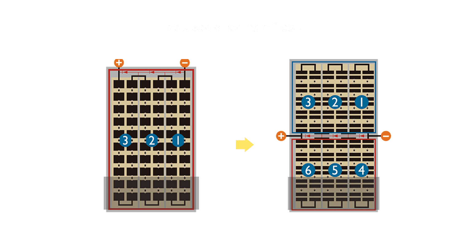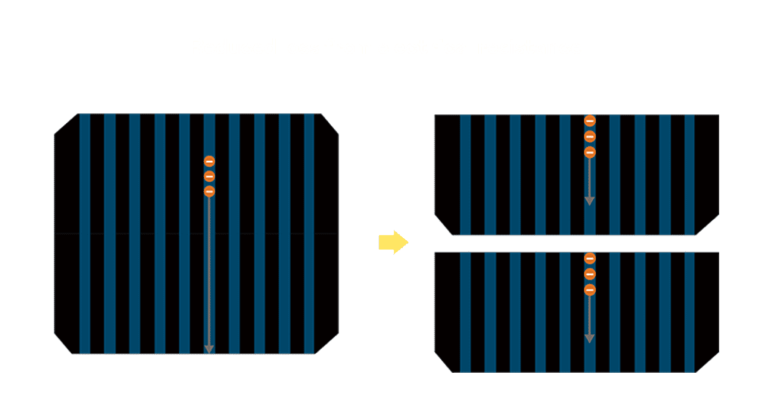- 结合半切电池,,降低遮阴影响、、、提升模组抗隐裂能力、、并减少电阻损耗,,进一步提升模组发电效能。。